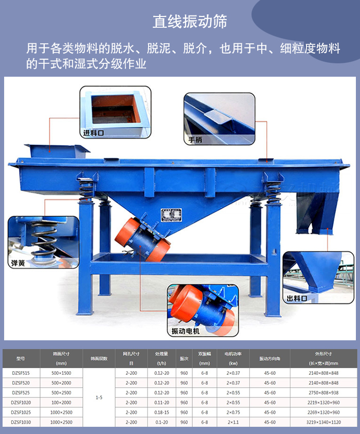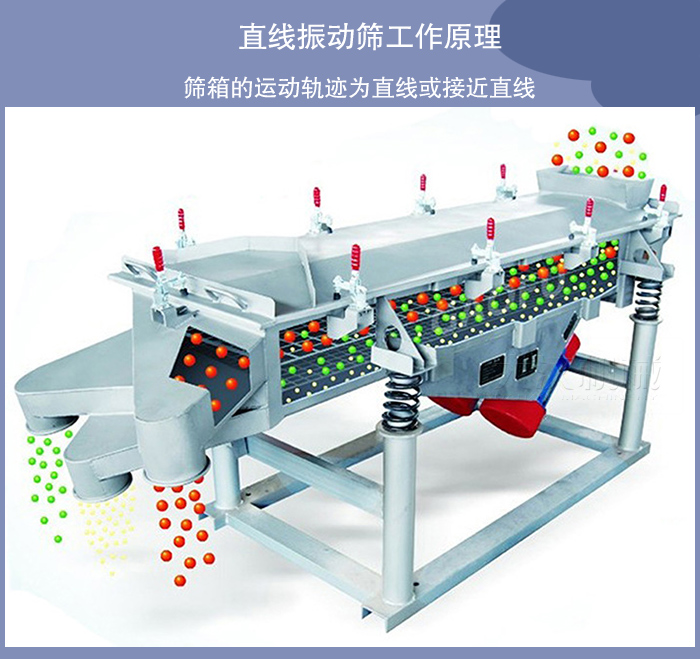 直線振動篩篩箱的運動軌跡為直線或接近直線,它有兩個軸,所以又稱雙軸振動篩。直線振動篩水平或傾斜安裝,這類振動篩結(jié)構(gòu)緊湊,運行平穩(wěn),被廣泛用于各類物料的脫水、脫泥、脫介,也用于中、細(xì)粒度物料的干式和濕式分級作業(yè)。我廠生產(chǎn)的直線振動篩種HZSF型號就是直線振動篩代表性的產(chǎn)品。