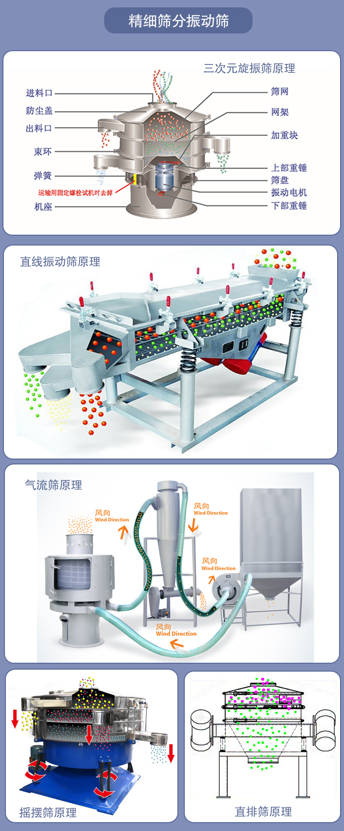 振動篩又被叫做篩粉機、電動篩,是一種適合與精細物料篩分的振動篩分機械設備,被各行各業(yè)所廣泛使用,尤其體現(xiàn)在食品行業(yè)和化工行業(yè)的生產(chǎn)活動中。振動篩設備分類廣泛,精細篩分設備是用處最廣的,那么小編今天就和大家分享精細篩分中各種篩分設備的原理。