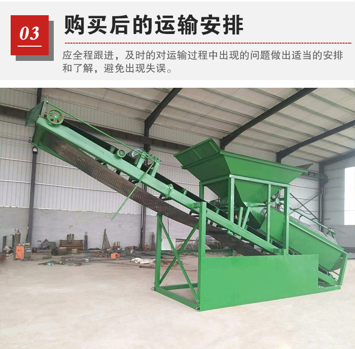 篩沙機在采購完畢后,廠家會在設備完成后進行運輸發(fā)貨,此時,用戶應全程跟進,及時的對運輸過程中出現(xiàn)的問題做出適當?shù)陌才藕土私猓苊鈴S家出現(xiàn)失誤,出現(xiàn)小配件漏發(fā)等問題。