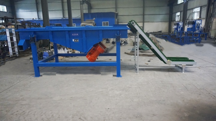 破碎機(jī) + 振動(dòng)篩:廢舊輪胎經(jīng)破碎機(jī)撕裂、破碎成橡膠塊后,由輸送帶送入振動(dòng)篩,通過粗篩網(wǎng)分離出未破碎完全的大塊橡膠與雜質(zhì),合格橡膠塊進(jìn)入下一道工序。