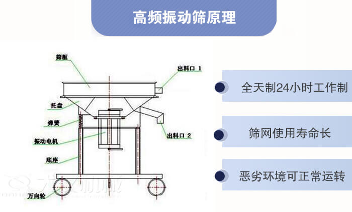 高頻振動篩又稱高頻過濾篩,結(jié)構(gòu)簡單、體積小、具有高頻率,低耗能的特點,頻率每分鐘可達(dá)3000次,比相同機(jī)型的篩分過濾設(shè)備耗能減少一半,與物料接觸部分皆可采用不銹鋼304或者316L材質(zhì)。