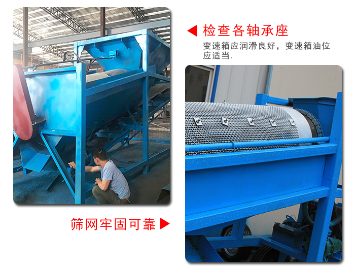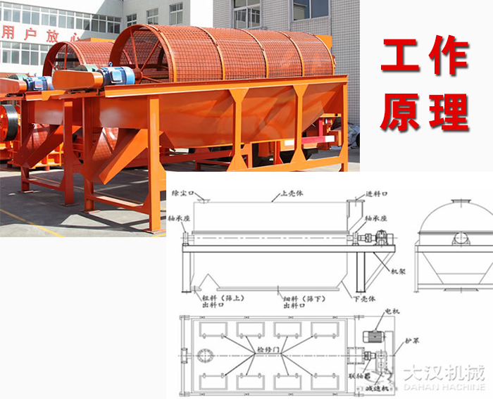 滾筒篩篩沙機(jī)主要由電機(jī)、減速機(jī)、滾筒裝置、機(jī)架、密封蓋、進(jìn)料口、出料口等部分組成。滾筒裝置傾斜安裝于機(jī)架上。電動機(jī)經(jīng)減速機(jī)與滾筒裝置通過聯(lián)軸器連接在一起,驅(qū)動滾筒裝置繞其軸線轉(zhuǎn)動。當(dāng)物料進(jìn)入滾筒裝置后,由于滾筒裝置的傾斜與轉(zhuǎn)動,使篩面上的物料翻轉(zhuǎn)與滾動,使合格物料(篩下產(chǎn)品)經(jīng)滾筒后端底部的出料口排出,不合格的物料(篩上產(chǎn)品)經(jīng)滾筒尾部的排料口排出。由于物料在滾筒內(nèi)的翻轉(zhuǎn)、滾動,使卡在篩孔中的物料可被彈出,防止篩孔堵塞。
