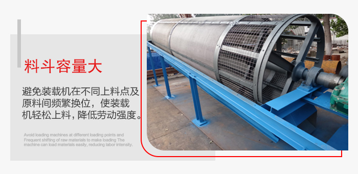 4.儲料斗容量大,使裝載機(jī)合理安排主設(shè)備(如攪拌站)與篩砂機(jī)的上料時間,避免裝載機(jī)在不同上料點 及原料間頻繁換位,使裝載機(jī)輕松上料,降低勞動強(qiáng)度。